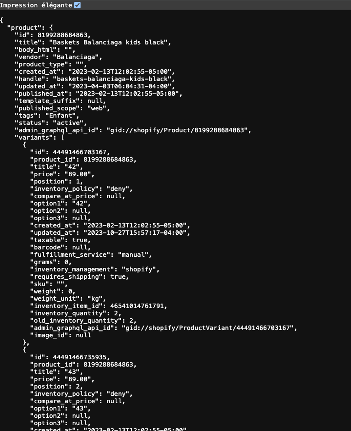 Voici une seconde méthode, pour avoir d'un seul coup tous les id de chaque variante du produit. Allez sur la fiche de votre produit. L'url va ressembler à quelque chose comme https://admin.shopify.com/store/monshop/products/8199167312191. Il existe une astuce pour passer à un affichage brut des données du produits, pour cela, ajoutez juste .json à l'adresse déjà présente dans la barre d'adresse. Ce qui donnerait dans notre exemple https://admin.shopify.com/store/monshop/products/8199167312191.json