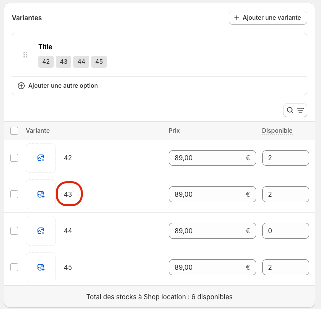 Première méthode : consulter l'url de chaque variante. Lorsque vous êtes sur la fiche du produit, descendez jusqu'à la liste des variantes, et ouvrez la variante dont vous souhaitez connaître l'id :