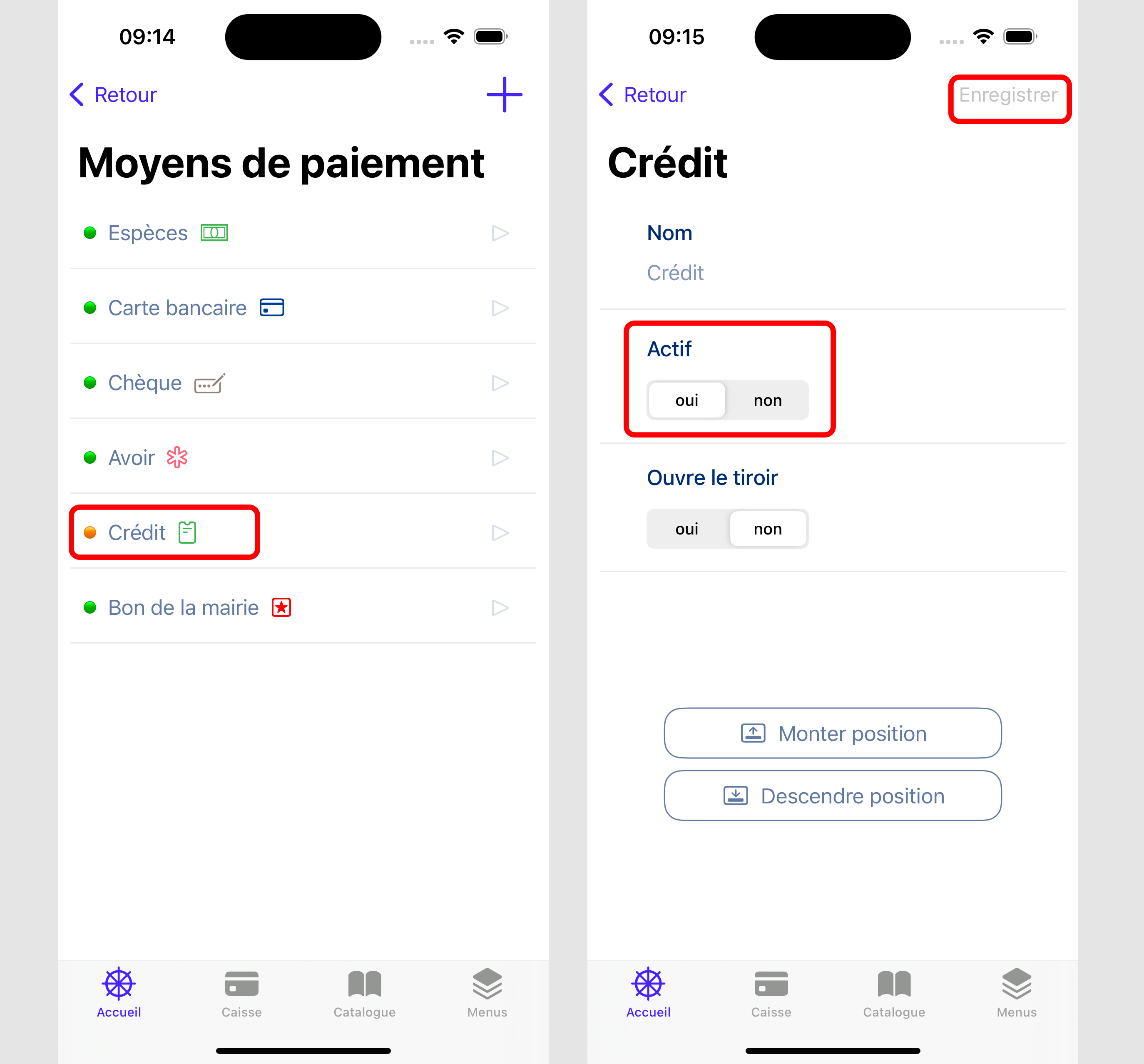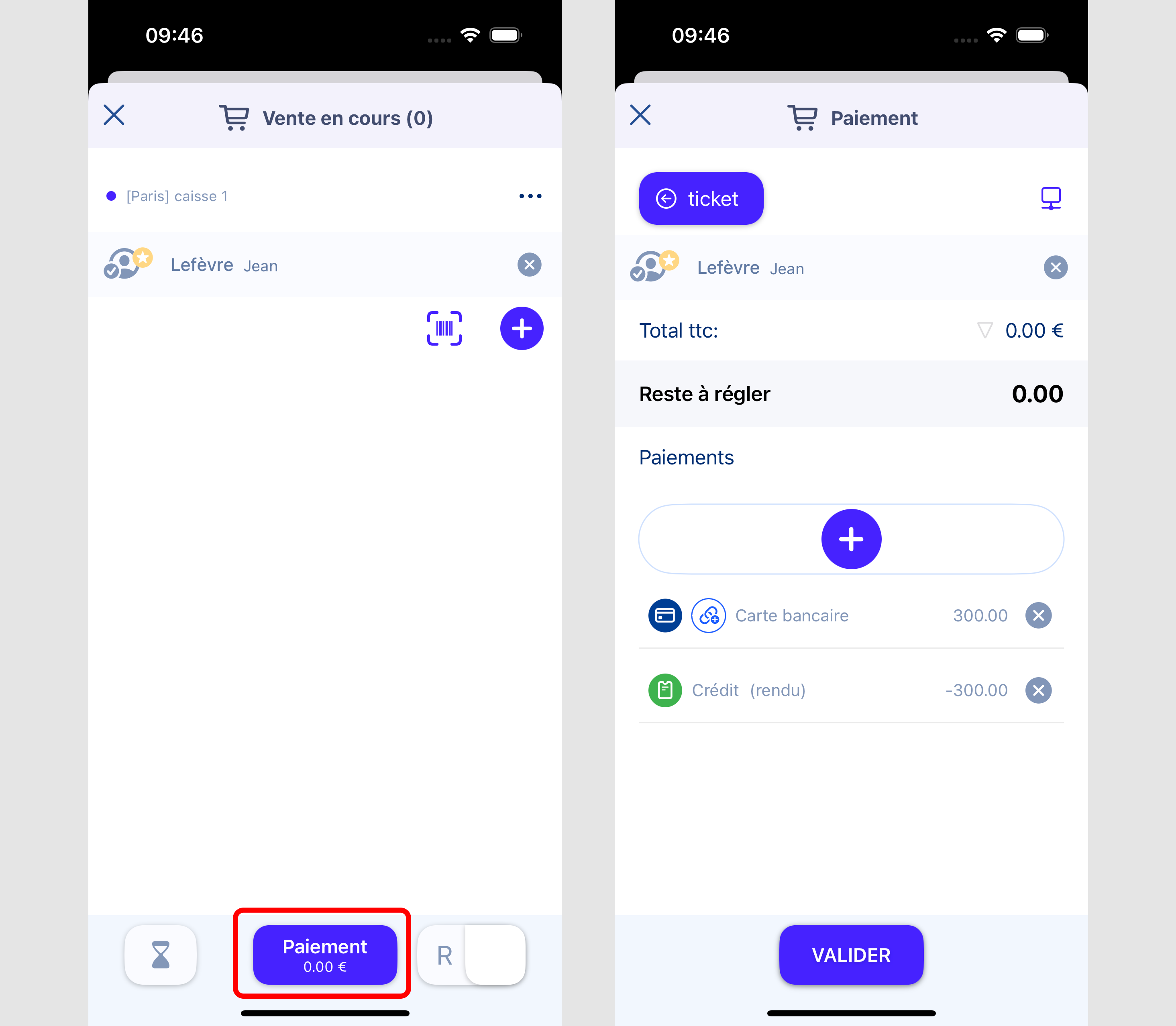- Ensuite vous faite le bouton + pour ajouter le moyen de paiement "crédit". L'application va automatiquement fair une ligne de "rendu" crédit du même montant, ce qui va solder son crédit.